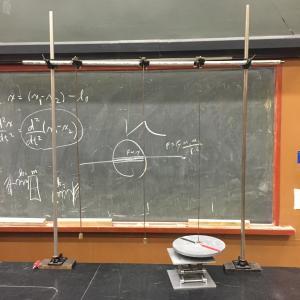 Large torsion pendulum with different diameter rods. Note: All rods can be mounted at once, as shown, or just one can be chosen. A Lab Jack is useful in raising and lowering the heavy disk and ring.