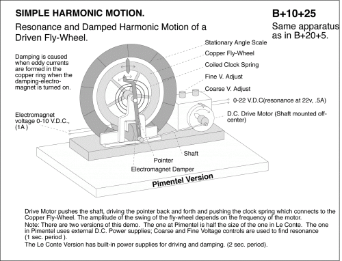 Resonance and Damped Harmonic Motion of a Driven Fly-Wheel. Drive Motor pushes the shaft, driving the pointer back and forth and pushing the clock spring which connects to the Copper Fly Wheel. The amplitude of the swing of the fly-wheel depends on the frequency of the motor. Note: There are two versions of this demo. The one at Pimentel is half the size of the one in Le Conte. The one in Pimentel uses external D.C. power supplies; Coarse and Fine Voltage controls are used to find resonance (1 sec. period). The Le Conte version has built in power supplies for driving and damping.
