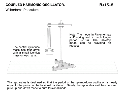 Wilberforce pendulum. This apparatus is designed so that the period of the up and down oscillation is nearly equal to the period of the torsional oscillation. Slowly the apparatus switches between pure up and down mode to pure torsional mode. Note: The model in Pimentel has a 4' spring and a much longer period (~15 sec). The tabletop model can be provided on request.