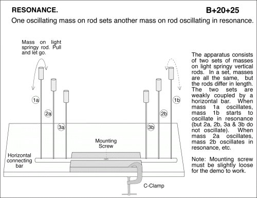 One oscillating mass on rod sets another mass on rod oscillating in resonance. The apparatus consists of two sets of masses on light springy vertical rods. In a set, masses are all the same, but the rods differ in length. The two sets are weakly coupled by a horizontal bar. When mass 1a oscillates, mass 1b starts to oscillate in resonance (but 2a, 2b, 3a & 3b do not oscillate). When mass 2a oscillates, mass 2b oscillates in resonance, etc. Note: Mounting screw must be slightly loose for the demo to work. Mass on light springy rod. Pull and let go.