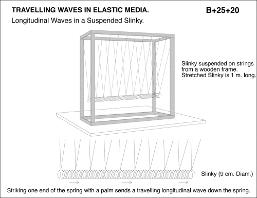 Longitudinal Waves in a Suspended Slinky. Slinky suspended on strings from a wooden frame. Stretched Slinky is 1 meter long. Striking one end of the spring with a palm sends a traveling longitudinal wave down the spring.