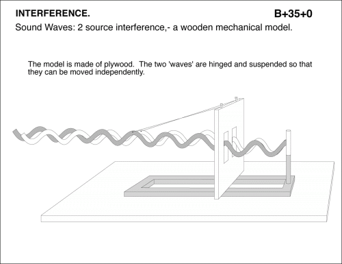 Sound Waves: 2 source interference, - a wooden mechanical model. The model is made of plywood. The two 'waves' are hinged and suspended so that they can be moved independently.