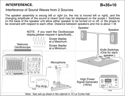 Interference of Sound Waves from 2 Sources. The speaker assembly is swung left or right (or, the mic is moved left or right), and the changing amplitude of the sound is heard (and may be displayed on the scope.) Switches on the base of the speaker unit allow either speaker to be turned on or off, or the phase to be reversed with respect to each other. Distance between speakers and mic is about 1 M. Note: If you want the oscilloscope display, please request it specifically...
