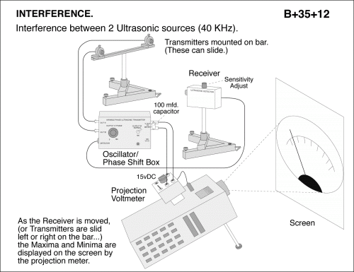 Interference between 2 Ultrasonic sources (40 KHz). As the receiver is moved (or transmitters are slid left or right on the bar...) the maxima and minima are displayed on the screen by the projection meter