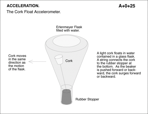 The Cork Float Accelerometer. A light cork floats in water contained in a glass flask. A string connects the cork to the rubber stopper at the bottom. As the beaker is pushed forward or backward, the cork surges forward or backward. Cork moves in the same direction as the motion of the flask.