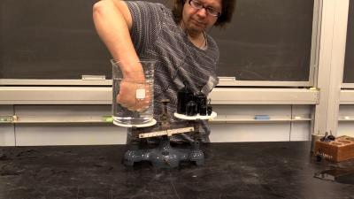 A container of water and a selection of masses are balanced on a scale. When a fist or other object is inserted into the water without touching the side of the container that side of the container becomes effectively much heavier and the scale tilts dramatically.