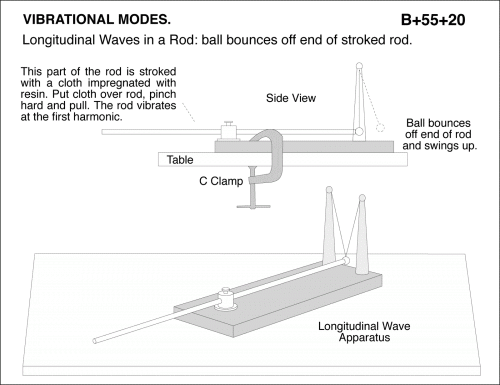 Longitudinal Waves in a Rod: ball bounces off end of stroked rod. This part of the rod is stroked with a cloth impregnated with resin. Put cloth over rod, pinch hard and pull. The rod vibrates at the first harmonic.