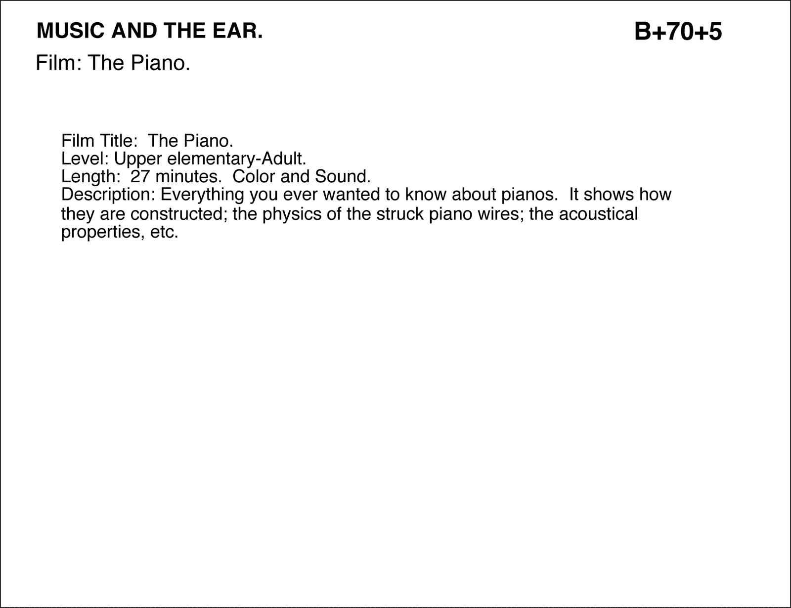 Film: The Piano. Film Title: The Piano. Level: Upper elementary-Adult. Length: 27 minutes. Color and Sound. Description: Everything you ever wanted to know about pianos. It shows how they are constructed; the physics of the struck piano wires; the acoustical properties, etc. MUSIC AND THE EAR.