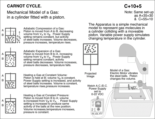 Mechanical Model of a Gas: in a cylinder fitted with a piston. The Apparatus is a simple mechanical model to represent gas molecules in a cylinder colliding with a moveable piston. Variable power supply simulates changing temperature in the cylinder. Adiabatic Compression of a Gas: Piston is moved from A to B, decreasing volume from V to V . Power Supply setting remains constant, but activity of steel balls increases. Volume decreases, pressure increases, temperature rises. Adiabatic Expansion of a Gas: Piston is moved from B to A, increasing volume from V to V . Power Supply setting remains constant; activity of steel balls decreases. Volume increases, pressure decreases, temperature falls. Heating a Gas at Constant Volume: Piston is held at B; volume V is constant. Power Supply setting is increased, and activity of steel balls increases. Volume is constant, temperature rises,pressure increases. Heating a Gas at Constant Pressure: Piston is moved from B to A; volume is increased from V to V . Power Supply setting is increased to produce same activity of the balls at the new position. Volume increases,temperature increases, pressure is constant. Note: Same set-up as A+35+30 & C+55+10