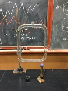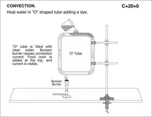 Heat water in "O" shaped tube adding a dye. "O" tube is filled with clear water. Bunsen burner causes convection current. Food color is added at the top, and current is visible. CONVECTION.