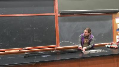 A piece of tubing is connected to a nozzle on the lectern. The amount of water flowing in can be controlled by the faucet. The end of the tube can be constricted to decrease the area water is passing through and hence increase the exit velocity. The hose can be tilted to show the distance traveled as a dependency on angle.