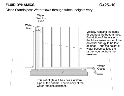 Glass standpipes: Water flows through tube, heights vary.This set of glass tubes has a uniform pipe at the bottom. The velocity of the water remains constant. Velocity remains the same throughout the bottom tube. But friction of the water in the tube causes some of the potential energy to be lost as heat. Thus the height of water becomes less the farther you get from the reservoir. FLUID DYNAMICS.