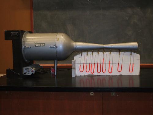 Venturi meter: Manometer tubes on tapered wind tunnel tube.