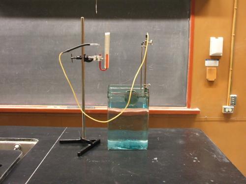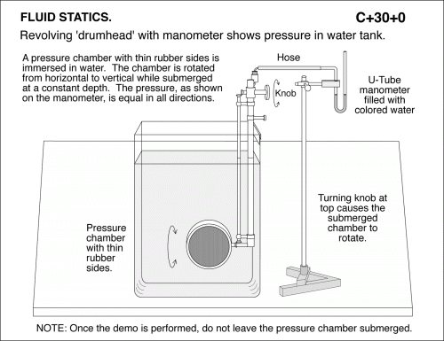Revolving 'drumhead' with manometer shows pressure in water tank. U-Tube manometer filled with colored water Pressure chamber with thin rubber sides. A pressure chamber with thin rubber sides is immersed in water. The chamber is rotated from horizontal to vertical while submerged at a constant depth. The pressure, as shown on the manometer, is equal in all directions. Turning knob at top causes the submerged chamber to rotate. NOTE: Once the demo is performed, do not leave the pressure chamber submerged. SURFACE TENSION AND CAPILLARY ACTION.