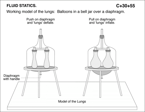 Working model of the lungs: Balloons in a bell jar over a diaphragm. Push on diaphragm and 'lungs' deflate. Pull on diaphragm and 'lungs' inflate. FLUID STATICS.