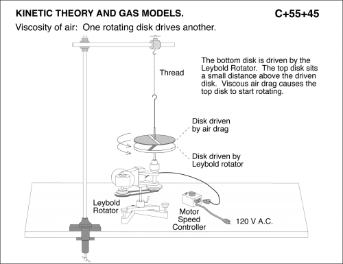 Viscosity of air: One rotating disk drives another.The bottom disk is driven by the Leybold Rotator. The top disk sits a small distance above the driven disk. Viscous air drag causes the top disk to start rotating. KINETIC THEORY AND GAS MODELS.