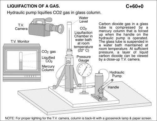 Hydraulic pump liquifies CO2 gas in glass column. Carbon dioxide gas in a glass tube is compressed by a mercury column that is forced up when the handle on the hydraulic pump is operated. The glass tube is suspended in a water bath maintained at room temperature. At sufficient pressure, a layer of liquid carbon dioxide can be viewed by a close-up T.V. camera. Liquifaction Chamber in water bath at room temperature (22deg C), Handle Water Level. NOTE: For proper lighting for the T.V. camera, column is back-lit with a gooseneck lamp & paper screen. LIQUIFICATION OF A GAS.