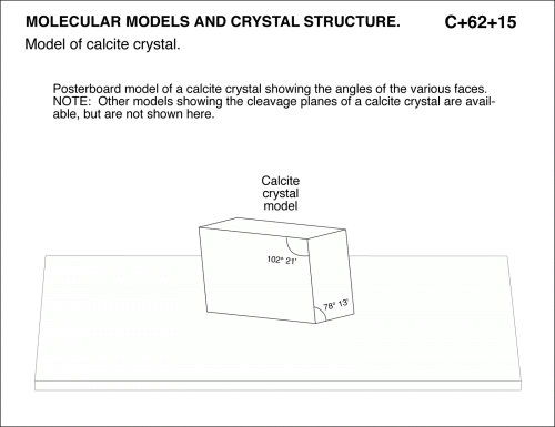 Model of calcite crystal. Posterboard model of a calcite crystal showing the angles of the various faces. NOTE: Other models showing the cleavage planes of a calcite crystal are available, but are not shown here. 78 deg 13' 102 deg 21' Calcite crystal model