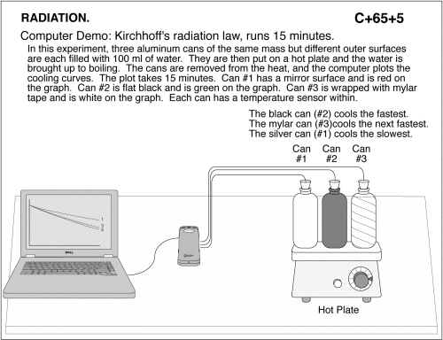 Computer Demo: Kirchhoff's radiation law, runs 15 minutes. In this experiment, three aluminum cans of the same mass but different outer surfaces are each filled with 100 ml of water. They are then put on a hot plate and the water is brought up to boiling. The cans are removed from the heat, and the computer plots the cooling curves. The plot takes 15 minutes. Can #1 has a mirror surface and is red on the graph. Can #2 is flat black and is green on the graph. Can #3 is wrapped with mylar tape and is white on the graph. Each can has a temperature sensor within. The black can (#2) cools the fastest. The mylar can (#3)cools the next fastest. The silver can (#1) cools the slowest. RADIATION.
