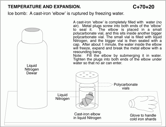 Ice bomb: An iron sphere is ruptured by freezing water. A cast-iron sphere is completely filled with water (no air). An iron plug screws into the sphere to block the hole. The sphere is placed in a metal-lined box and covered with dry ice. After 3 or 4 minutes, the water inside the sphere will freeze and expand and break the metal ice bomb with a resounding bang. NOTES: 1] Fill the bomb by submerging it in water. Tighten the plug under water so that no air can enter. 2] Instead of dry ice, a mixture of regular ice and salt can be used. It will then take about 20 minutes to break the bomb. TEMPERATURE AND EXPANSION.
