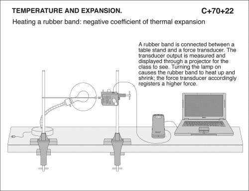 Heating a Rubber Band: negative coefficient of thermal expansion. A rubber band is connected between a table stand and a force transducer. The transducer output is measured and displayed through a projector for the class to see. Turning the lamp on causes the rubber band to heat up and shrink; the force transducer accordingly registers a higher force. TEMPERATURE AND EXPANSION.