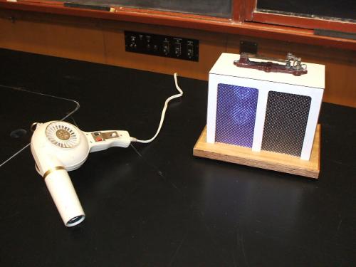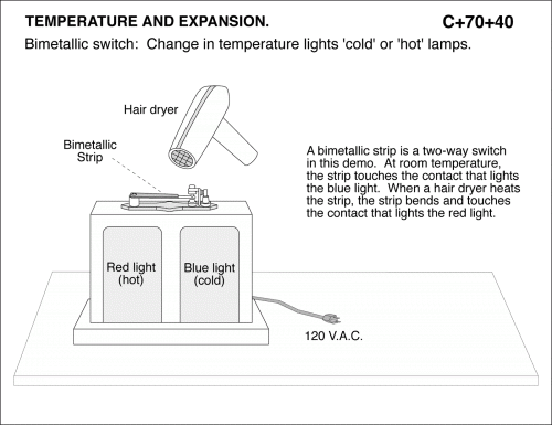 Bimetallic switch: Change in temperature lights 'cold' or 'hot' lamps. A bimetallic strip is a two-way switch in this demo. At room temperature, the strip touches the contact that lights the blue light. When a hair dryer heats the strip, the strip bends and touches the contact that lights the red light. TEMPERATURE AND EXPANSION.