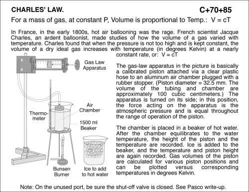 Charles' Law: At constant P, Volume is proportional to Temperature. Apparatus Note: On the unused port, be sure the shut-off valve is closed. See Pasco write-up. In France, in the early 1800s, hot air ballooning was the rage. French scientist Jacque Charles, an ardent balloonist, made studies of how the volume of a gas varied with temperature. Charles found that when the pressure is not too high and is kept constant, the volume of a dry ideal gas increases with temperature (in degrees Kelvin) at a nearly constant rate, or: V = cT The gas-law apparatus in the picture is basically a calibrated piston attached via a clear plastic hose to an aluminum air chamber plugged with a rubber stopper. (Piston diameter = 32.5 mm. The volume of the tubing and chamber are approximately 100 cubic centimeters.) The apparatus is turned on its side; in this position, the force acting on the apparatus is the atmospheric pressure and is equal throughout the range of operation of the piston. The chamber is placed in a beaker of hot water. After the chamber equilibrates to the water temperature, the height of the piston and the temperature are recorded. Ice is added to the beaker, and the temperature and piston height are again recorded. Gas volumes of the piston are calculated for various piston positions and can be plotted versus corresponding temperatures in degrees Kelvin. THERMOMETRY
