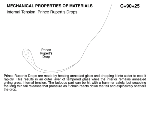 Internal Tension: Prince Rupert's Drops Prince Rupert's Drops are made by heating annealed glass and dropping it into water to cool it rapidly. This results in an outer layer of tempered glass while the interior remains annealed giving great internal tension. The bulbous part can be hit with a hammer safely, but snapping the long thin tail releases that pressure as it chain reacts down the tail and explosively shatters the drop.