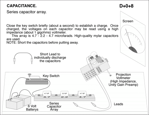 Series capacitor array. Close the key switch briefly (about a second) to establish a charge. Once charged, the voltages on each capacitor may be read using a high impedance (about 1 gigohms) voltmeter. This array is 4.7 - 2.2 - 4.7 microfarads. High-quality mylar capacitors are used. NOTE: Short the capacitors before putting away. CAPACITANCE.