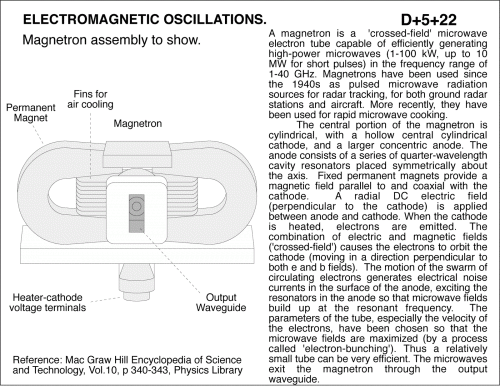 Magnetron assembly to show. A magnetron is a 'crossed-field' microwave electron tube capable of efficiently generating high-power microwaves (1-100 kW, up to 10 MW for short pulses) in the frequency range of 1-40 GHz. Magnetrons have been used since the 1940s as pulsed microwave radiation sources for radar tracking, for both ground radar stations and aircraft. More recently, they have been used for rapid microwave cooking. The central portion of the magnetron is cylindrical, with a hollow central cylindrical cathode, and a larger concentric anode. The anode consists of a series of quarter-wavelength cavity resonators placed symmetrically about the axis. Fixed permanent magnets provide a magnetic field parallel to and coaxial with the cathode. A radial DC electric field (perpendicular to the cathode) is applied between anode and cathode. When the cathode is heated, electrons are emitted. The combination of electric and magnetic fields ('crossed-field') causes the electrons to orbit the cathode (moving in a direction perpendicular to both e and b fields). The motion of the swarm of circulating electrons generates electrical noise currents in the surface of the anode, exciting the resonators in the anode so that microwave fields build up at the resonant frequency. The parameters of the tube, especially the velocity of the electrons, have been chosen so that the microwave fields are maximized (by a process called 'electron-bunching'). Thus a relatively small tube can be very efficient. The microwaves exit the magnetron through the output waveguide. Reference: Mac Graw Hill Encyclopedia of Science and Technology, Vol.10, p 340-343, Physics Library