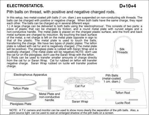 Pith balls on thread, with positive and negative charged rods. NOTE: A T.V. camera and monitor can be used to show more clearly the separation of the pith balls. Also, a point source light can be used to cast an enlarged shadow of the pith balls on a screen. In this setup, two metal-coated pith balls (1 cm. diam.) are suspended on non-conducting silk threads. The balls can be charged with positive or negative charge. When both balls have the same charge, they repel each other. The balls can be charged up in several different ways: 1.) A large charge can be delivered to both balls using the 'electrophorous'. This consists of two parts: a piece of plastic that can be charged by friction; and a round metal plate with curved edges and a non-conductive handle. The metal plate is placed on the charged plastic surface, and the front and back metal surfaces are charged by induction. By touching the back surface of the metal, a net charge is left on the metal plate opposite in sign to that of the plastic. The metal plate is used to touch the balls, transferring the charge. We have two types of plastic plates: The teflon plate is rubbed with cat fur and is negatively charged. (The metal plate will be positive). The plexiglass plate is rubbed with Saran Wrap and is positively charged. (The metal plate will be negative).NOTE: don't use the cat fur on the plexiglass; don't use the Saran Wrap with the teflon. 2.) Rods can be used to transfer smaller amounts of charge directly from the cat fur or Saran Wrap. Cat fur rubbed on teflon will transfer negative charge. Saran Wrap rubbed on lucite will transfer positive charge.