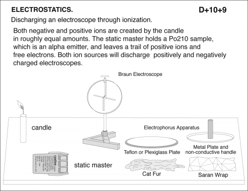 Discharging an electroscope through ionization. Both negative and positive ions are created by the candle in roughly equal amounts. The static master holds a Po210 sample, which is an alpha emitter, and leaves a trail of positive ions and free electrons. Both ion sources will discharge positively and negatively charged electroscopes. caution Radiation from polonium is dangerous if the solid material is ingested or inhaled. Do not touch strip under grid. Keep away from children. See instructions. Replace after: June 2008 Model No: 1C200 NRD. LIC GRAND ISLAND, NY 14072