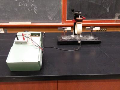 Alternator: Coil with AC commutator rotates between magnets. This is a simple alternator illustrating the principle that a changing magnetic field cutting across a loop of wire induces an electric current. In this case, the magnetic field is produced by two strong permanent bar magnets mounted in line with each other, on opposite sides of the wire coil; close to the perimeter of the coil. The coil of wire is rotated in this magnetic field, generating an emf. The crank-handle/pulley system is on the back of the apparatus, not visible in this drawing. The 'slip-ring' commutator causes the output of the alternator to be A.C. current in the milliamp range. For example, crank the handle clockwise or counterclockwise, and the current will go from 0 to +.5 ma to 0 to -.5 ma to 0, etc.