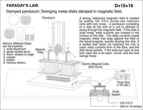 Damped pendulum: Swinging metal disks damped in magnetic field. A strong, stationary magnetic field is created by putting 120 V.D.C across two multi-turn coils with iron cores. A pendulum consisting of a disk at the end of a rod is allowed to swing through the magnetic field. If the disk is solid metal, eddy currents are created in the surface of the disk. The eddy currents create magnetic fields that drag against the field of the electromagnet, quickly slowing the disk. If a slotted disk (slots not reaching the rim) is used, eddy currents form in the bars, and the disk slows quickly. If the slots are open at one end, each bar is an open circuit, and the disk swings freely. Various different Disks can be inserted: 1. solid aluminum 2. partly slotted alum. 3. Alum. slotted to edge 4. copper 5. plastic 6. various others...