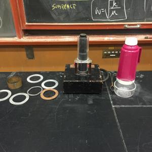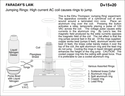 Jumping Rings: High current AC coil causes rings to jump. This is the Elihu Thompson 'Jumping Ring' experiment. The apparatus consists of a cylindrical coil of wire wound around a laminated iron core. Place an aluminum ring over the coil. Pressing the button activates a relay, temporarily placing a pulse of 120 VAC across the coil. The voltage pulse causes eddy currents in the aluminum ring. By Lenz's law, the magnetic field produced by the eddy currents opposes the magnetic field of the coil. The net effect is that the ring jumps several feet in the air. Of the rings supplied, copper works best (jumps 6 feet), aluminum works next best (3 feet), the brass collar barely makes it over the top of the coil, the split aluminum ring and the lead ring do not jump. Cooling the rings in liquid nitrogen greatly enhances the height of the ring jump. CAUTION: The cooled copper ring hits the ceiling with great force. Thus it is preferable to use a cooled aluminum ring. Various Assorted Rings: 1. Soldered brass Collar 2. Aluminum ring (2) 3. Split aluminum ring 4. Copper ring 5. Lead Ring