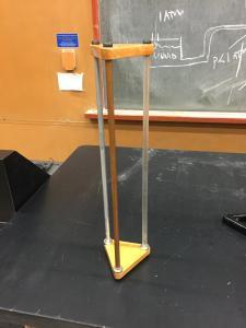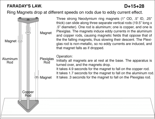 Ring Magnets drop at different speeds on rods due to eddy current effect. Three strong Neodymium ring magnets (1 inch OD, .5 inch ID, .25 inch thick) can slide along three separate vertical rods (19.5 inch long x .5 inch diameter). One rod is aluminum; one is copper, and one is Plexiglas. The magnets induce eddy currents in the aluminum and copper rods, causing magnetic fields that oppose that of the the falling magnets, thus slowing their descent. The Plexiglas rod is non-metallic, so no eddy currents are induced, and that magnet falls as if dropped. Operation: Initially all magnets are at rest at the base. The apparatus is turned over, and the magnets drop. It takes 4.9 seconds for the magnet to fall on the copper rod. It takes 1.7 seconds for the magnet to fall on the aluminum rod. It takes .3 seconds for the magnet to fall on the Plexiglas rod.