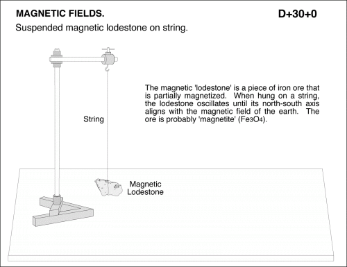 Suspended magnetic lodestone on string. The magnetic 'lodestone' is a piece of iron ore that is partially magnetized. When hung on a string, the lodestone oscillates until its north-south axis aligns with the magnetic field of the earth. The ore is probably 'magnetite' (Fe3O4).