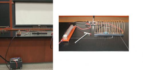 Magnetic field around a solenoid with pivoting probe magnet. A large D.C. current (about 100 Amps), is sent through a simple solenoid coil made of heavy copper wire. The magnetic field produced is explored by a hand-held 'exploring magnet', or with a compass needle on a stand. NOTE: The current is large, so a Timer box is set for 20 seconds to remind one to turn the demo off. Also, double wires are used from the switch to the coil in order to handle the large current.
