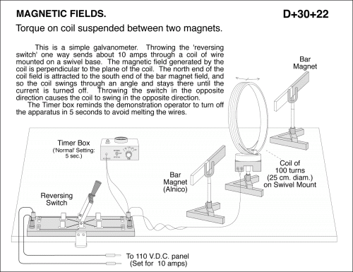 Torque on coil suspended between two magnets. This is a simple galvanometer. Throwing the 'reversing switch' one way sends about 10 amps through a coil of wire mounted on a swivel base. The magnetic field generated by the coil is perpendicular to the plane of the coil. The north end of the coil field is attracted to the south end of the bar magnet field, and so the coil swings through an angle and stays there until the current is turned off. Throwing the switch in the opposite direction causes the coil to swing in the opposite direction. The Timer box reminds the demonstration operator to turn off the apparatus in 5 seconds to avoid melting the wires.