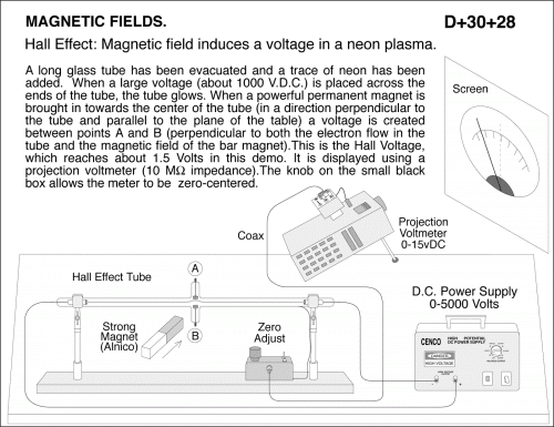 Hall effect: Magnetic field induces a voltage in a neon plasma. A long glass tube has been evacuated and a trace of neon has been added. When a large voltage (about 1000 V.D.C.) is placed across the ends of the tube, the tube glows. When a powerful permanent magnet is brought in towards the center of the tube (in a direction perpendicular to the tube and parallel to the plane of the table) a voltage is created between points A and B (perpendicular to both the electron flow in the tube and the magnetic field of the bar magnet).This is the Hall Voltage, which reaches about 1.5 Volts in this demo. It is displayed using a projection voltmeter (10 M ohms impedance).The knob on the small black box allows the meter to be zero-centered.