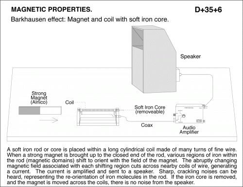 Barkhausen effect: Magnet and coil with soft iron core. A soft iron rod or core is placed within a long cylindrical coil made of many turns of fine wire. When a strong magnet is brought up to the closed end of the rod, various regions of iron within the rod (magnetic domains) shift to orient with the field of the magnet. The abruptly changing magnetic field associated with each shifting region cuts across nearby coils of wire, generating a current. The current is amplified and sent to a speaker. Sharp, crackling noises can be heard, representing the re-orientation of iron molecules in the rod. If the iron core is removed, and the magnet is moved across the coils, there is no noise from the speaker.