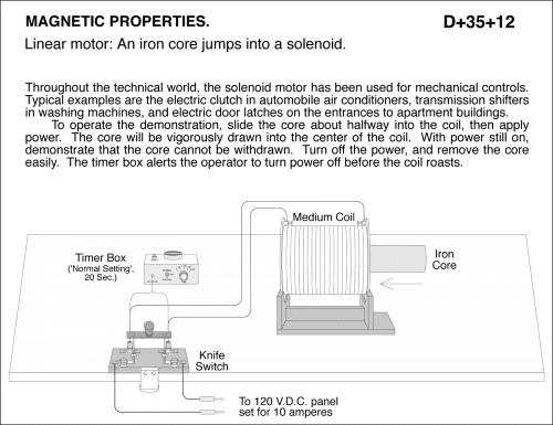 Linear motor: An iron core jumps into a solenoid. Throughout the technical world, the solenoid motor has been used for mechanical controls. Typical examples are the electric clutch in automobile air conditioners, transmission shifters in washing machines, and electric door latches on the entrances to apartment buildings. To operate the demonstration, slide the core about halfway into the coil, then apply power. The core will be vigorously drawn into the center of the coil. With power still on, demonstrate that the core cannot be withdrawn. Turn off the power, and remove the core easily. The timer box alerts the operator to turn power off before the coil roasts.