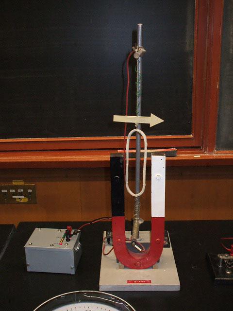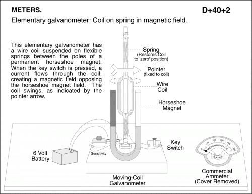 Elementary galvanometer: Coil on spring in magnetic field. This elementary galvanometer has a wire coil suspended on flexible springs between the poles of a permanent horseshoe magnet. When the key switch is pressed, a current flows through the coil, creating a magnetic field opposing the horseshoe magnet field. The coil swings, as indicated by the pointer arrow.