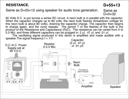 Same as D+55+12 using speaker for audio tone generation. 90 Volts D.C. is put across a series RC circuit. A neon bulb is in parallel with the capacitor. When the capacitor charges up to 80 volts, the neon bulb flashes (breakdown voltage for this neon bulb is about 80 volts), draining the capacitor charge. The capacitor then begins to charge again, and the cycle repeats. The period T of the flashes of the bulb is the product of the Resistance and Capacitance (RxC). The resistance can be varied from 0 to 5.5 M ohms, and three different capacitors can be plugged in: 2 micro f, .47 micro f, and .01 micro f. The oscillating signal produced in this demo is amplified and made audible with a speaker.The signal frequency f = 1/T.