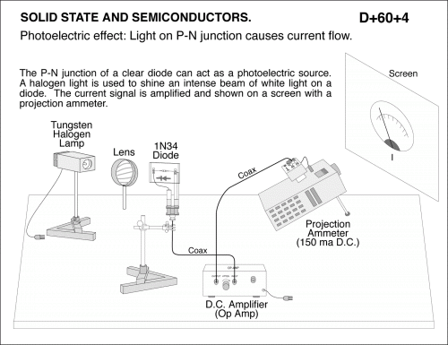 Photoelectric effect: Light on P-N junction causes current flow. The P-N junction of a clear diode can act as a photoelectric source. A halogen light is used to shine an intense beam of white light on a diode. The current signal is amplified and shown on a screen with a projection ammeter.
