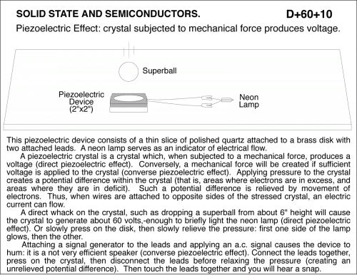 Piezoelectric Effect: crystal subjected to mechanical force produces voltage. This piezoelectric device consists of a thin slice of polished quartz attached to a brass disk with two attached leads. A neon lamp serves as an indicator of electrical flow. A piezoelectric crystal is a crystal which, when subjected to a mechanical force, produces a voltage (direct piezoelectric effect). Conversely, a mechanical force will be created if sufficient voltage is applied to the crystal (converse piezoelectric effect). Applying pressure to the crystal creates a potential difference within the crystal (that is, areas where electrons are in excess, and areas where they are in deficit). Such a potential difference is relieved by movement of electrons. Thus, when wires are attached to opposite sides of the stressed crystal, an electric current can flow. A direct whack on the crystal, such as dropping a superball from about 6" height will cause the crystal to generate about 60 volts,-enough to briefly light the neon lamp (direct piezoelectric effect). Or slowly press on the disk, then slowly relieve the pressure: first one side of the lamp glows, then the other. Attaching a signal generator to the leads and applying an a.c. signal causes the device to hum: it is a not very efficient speaker (converse piezoelectric effect). Connect the leads together, press on the crystal, then disconnect the leads before relaxing the pressure (creating an unrelieved potential difference). Then touch the leads together and you will hear a snap.