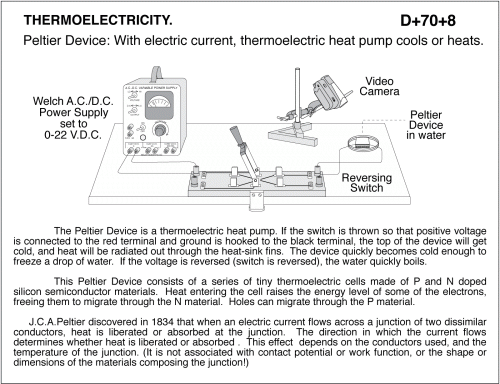 Peltier Device. The Peltier Device is a thermoelectric heat pump. If the switch is thrown so that positive voltage is connected to the red terminal and ground is hooked to the black terminal, the top of the device will get cold, and heat will be radiated out through the heat-sink fins. The device quickly becomes cold enough to freeze a drop of water. If the voltage is reversed (switch is reversed), the water quickly boils. J.C.A.Peltier discovered in 1834 that when an electric current flows across a junction of two dissimilar conductors, heat is liberated or absorbed at the junction. The direction in which the current flows determines whether heat is liberated or absorbed . This effect depends on the conductors used, and the temperature of the junction. (It is not associated with contact potential or work function, or the shape or dimensions of the materials composing the junction!) Peltier, sending a current through a thermocouple made of antimony and bismuth, froze a drop of water: the first demonstration of thermoelectric refrigeration. This Peltier Device consists of a series of tiny thermoelectric cells made of P and N doped silicon semiconductor materials. Heat entering the cell raises the energy level of some of the electrons, freeing them to migrate through the N material. Holes can migrate through the P material. This module will produce or absorb 2.9 Watts of power when 2.5 amps flow through it at 2.06 volts. It will exhibit a change in temperature of 67 degrees C at that current. NOTE: Not more than 2.1 amps should flow through the device. If a 6 volt battery is used, then an 1.5 Ohm 10 Watt current-limiting resistor should be in the circuit. A Genencon hand-generator (not shown) can also be used