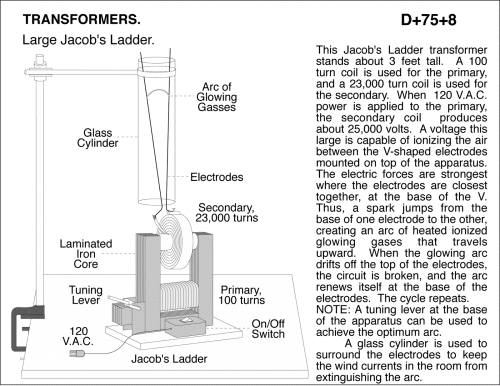 Large Jacob's Ladder. This Jacob's Ladder transformer stands about 3 feet tall. A 100 turn coil is used for the primary, and a 23,000 turn coil is used for the secondary. When 120 V.A.C. power is applied to the primary, the secondary coil produces about 25,000 volts. A voltage this large is capable of ionizing the air between the V-shaped electrodes mounted on top of the apparatus. The electric forces are strongest where the electrodes are closest together, at the base of the V. Thus, a spark jumps from the base of one electrode to the other, creating an arc of heated ionized glowing gases that travels upward. When the glowing arc drifts off the top of the electrodes, the circuit is broken, and the arc renews itself at the base of the electrodes. The cycle repeats. NOTE: A tuning lever at the base of the apparatus can be used to achieve the optimum arc. A glass cylinder is used to surround the electrodes to keep the wind currents in the room from extinguishing the arc.