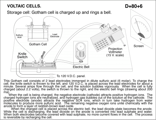 Storage cell: Gotham cell is charged up and rings a bell. This Gotham cell consists of 2 lead electrodes immersed in dilute sulfuric acid (6 molar). To charge the cell, the knife switch is thrown to the left, and 120 V.D.C. is placed across the lead electrodes for about a minute. Several amps flow through the cell, and the solution bubbles vigorously. When the cell is fully charged (about 2.2 volts), the switch is thrown to the right, and the electric bell rings (drawing about 200 ma). When the cell is being charged, the negative electrode (cathode) attracts positive hydrogen ions. The charged hydrogen ions are neutralized, and hydrogen gas bubbles out of the solution at the cathode. The positive electrode (anode) attracts the negative SO4 ions, which in turn take hydrogen from water molecules to produce more sulfuric acid. The remaining negative oxygen ions unite chemically with the anode to form a layer of reddish-brown lead oxide. When the charged cell is placed across the electric bell, the lead dioxide plate becomes the anode. While the cell is discharging, the lead dioxide on the anode is converted into lead sulphate and water. When both electrodes become covered with lead sulphate, no more current flows in the cell. The process is reversible by recharging the cell.