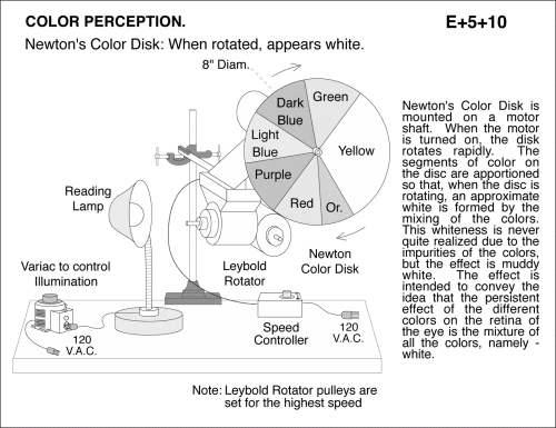 Newton's Color Disk: When rotated, appears white. Newton's Color Disk is mounted on a motor shaft. When the motor is turned on, the disk rotates rapidly. The segments of color on the disc are apportioned so that, when the disc is rotating, an approximate white is formed by the mixing of the colors. This whiteness is never quite realized due to the impurities of the colors, but the effect is muddy white. The effect is intended to convey the idea that the persistent effect of the different colors on the retina of the eye is the mixture of all the colors, namely - white. Note: Leybold Rotator pulleys are set for the highest speed.